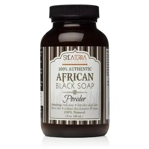 Rumors have it that real black soap is actually brown. What? Stop the record. Wouldn't brown soap be called, well, brown? Shea Terra Organics demystifies the myth of true African black soap, right here in this jar. Feast your eyes upon the real thing and all of your doubts will be put to rest. Yes Atlanta, African black soap really is black. So what makes African black soap black anyhow, and what am I going to get in this jar? Tradition has it that the first African black soap was invented by the Yoruban tribe of Nigeria. Believed to have migrated from Egypt, or perhaps Nuba, Southern Egypt, this tribe had significant knowledge of herbal medicine. Although a few of the original ingredients have probably changed a little, the age-old method of producing true black African black soap remains the same. Plantain peels, cocoa pods, camwood, and palm kernels are roasted together in clay ovens. In order to make soap one must have oil and potash. The ashes of the pods and peels act as the potash, and the oil-rich kernels exude their oil right in the clay oven. The ashes are then broken down, packed, flown to Dulles Airport, and then packaged in this convenient jar awaiting all your African black soap fantasies. 100% Pure African Black Soap is in its raw powder form. Nothing has been added to it. You add your own water and depending upon how much you can make the soap into a putty or a liquid. Use it all over your face and body, as well as on your scalp. This power soap can help clear skin from a multitude of pathogen-borne diseases. Many acne sufferers can't believe how well their skin has improved after only a few uses. 100% Pure African Black Soap works to dissolve sebum in the skin, which holds onto dead skin. Once washed away, you will not believe how much younger, firmer, and healthier your skin can look. The soap is used by men to help ward off razor bumps as it keeps the skin even and irritation-free. Working away at dead skin can even help decrease pigmentation. With all that being said you are probably wondering if wouldn't it be better to just buy a bar of African Black Soap from a local retail chain. No!!! Nothing could be farther from the truth. Yes, the bars might be shiny, nicely packaged, and smell like perfume (why do they say natural fragrance when they are made from perfume anyhow... that's another story entirely). But, there are tons of imitation black soaps on the market. Although they claim to be true African Black Soap, they are nothing but vegetable-based soaps that have been dyed black. Why are we telling you this? Because we believe it is an insult to the original makers of real African Black Soap. This is not much different from Amish dolls made in China or American Indian relics made in Singapore. Furthermore, imitation black soap won't do anything more than any other regular bar of soap made with chemicals. Without true African black soap, you never reap all its therapeutic benefits. *Our products are made with natural and organic ingredients to treat your hair and skin well. However, keep in mind that results may vary!